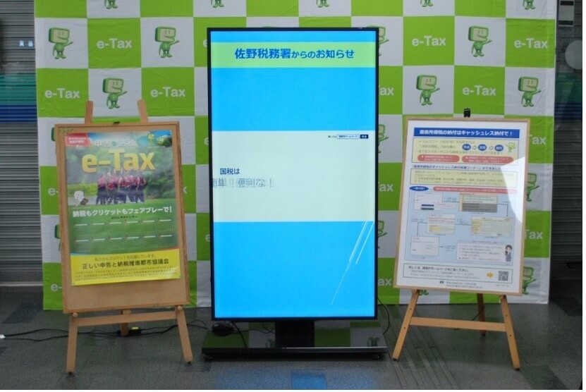 (写真=デジタルサイネージ(中央)、キャッシュレス納付PR用パネル(右))