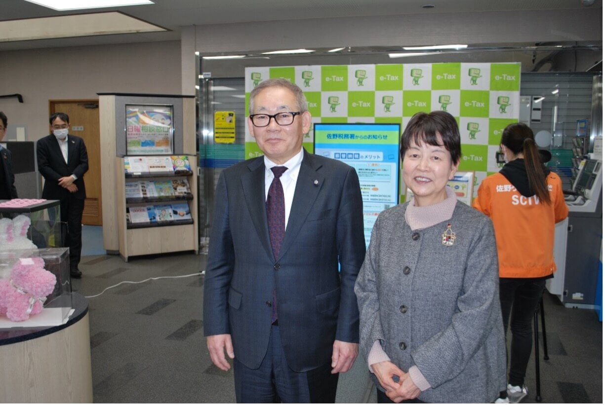 入賞者2名を一日税務署長として委嘱し、本年初めて、「佐野市長(金子裕市長)」を表敬訪問して「税の作品集の寄贈」及び「自宅e-Tax申告のPR」を行うこととし、1月23日(金)、佐野市役所を訪問し、慣れない手つきで名刺交換をした。