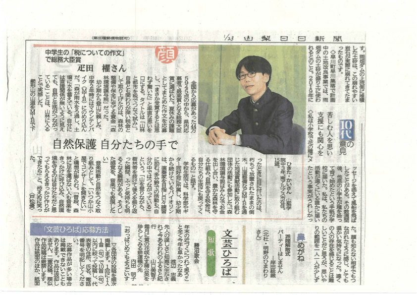 総務大臣賞の疋田さんが新聞に登場 今年度の中学生の「税についての作文」で、総務大臣賞を受けた山梨学院中学校3年の疋田櫂さんがこのほど、地元新聞の山梨日日新聞に掲載されたので紹介する。 前の記事 次の記事