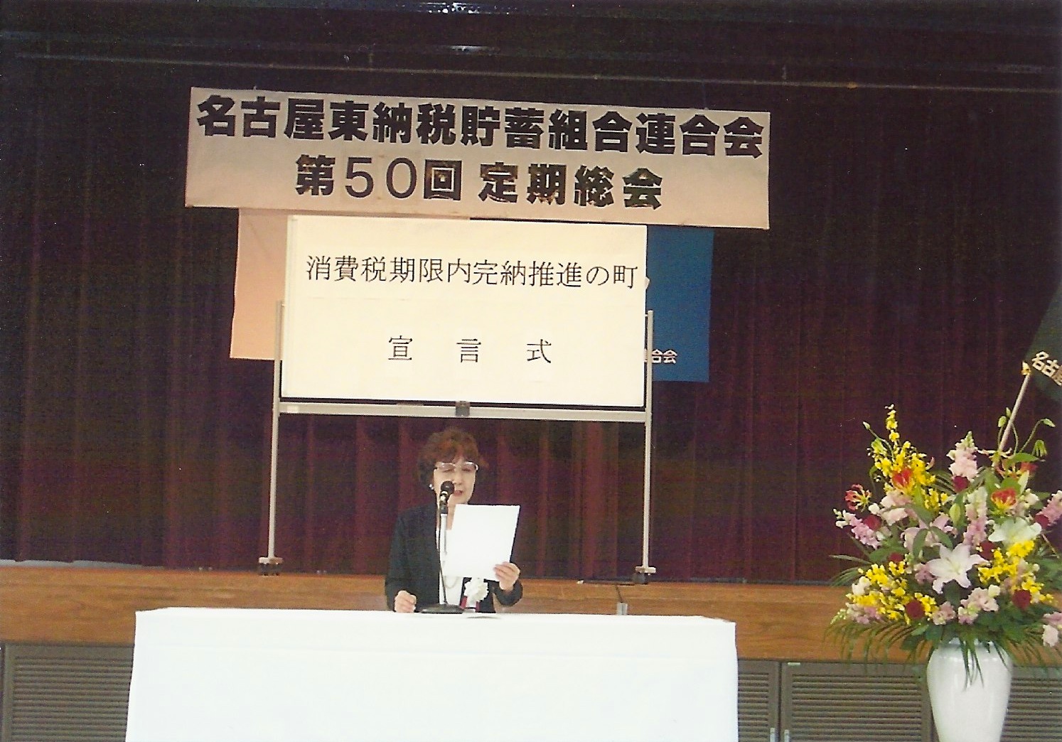 当日は、名古屋東税務署の増田宏之署長ら多数の来賓が出席する中、田口会長が「消費税滞納の未然防止が国の財政基盤を安定させる上で極めて重要であることを改めて認識し、消費税の期限内完納推進のため各種施策に積極的に取り組むことをここに宣言する」と読み上げた。