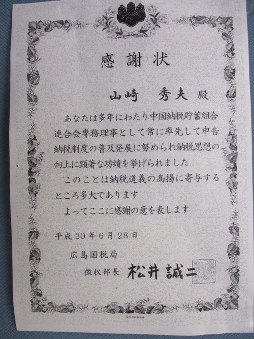 山崎専務理事は中国納連事務局の代表として、納貯活動を長年にわたって支えているが、事務局関係者が国税当局から感謝状を受けるのはきわめて珍しいことである。同専務理事は「上原会長はじめ各県連、地区(署)連の活動があって、私がいただいたものです」と話している。(写真は感謝状)