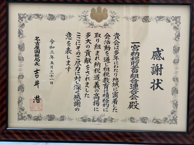 当日は、一宮税務署で、名古屋国税局の平岡弘行徴収部長から小出会長が感謝状を受け取った。