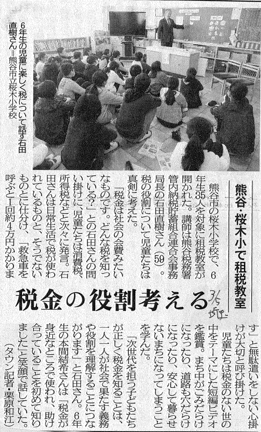2月8日、埼玉県熊谷市の桜木小学校で6年生を対象に租税教室が開かれました。講師は熊谷税務署管内納税貯蓄組合連合会事務局長の石田直樹さん。
