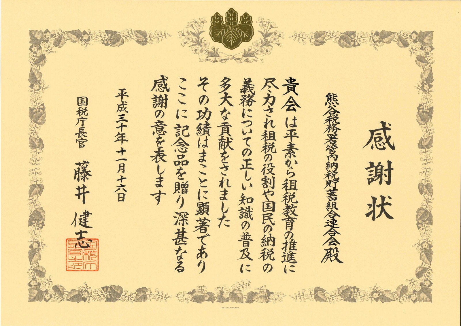 埼玉県熊谷税務署管内納税貯蓄組合連合会(飯島賢二会長)は11月16日、藤井健志国税庁長官感謝状を受賞した。